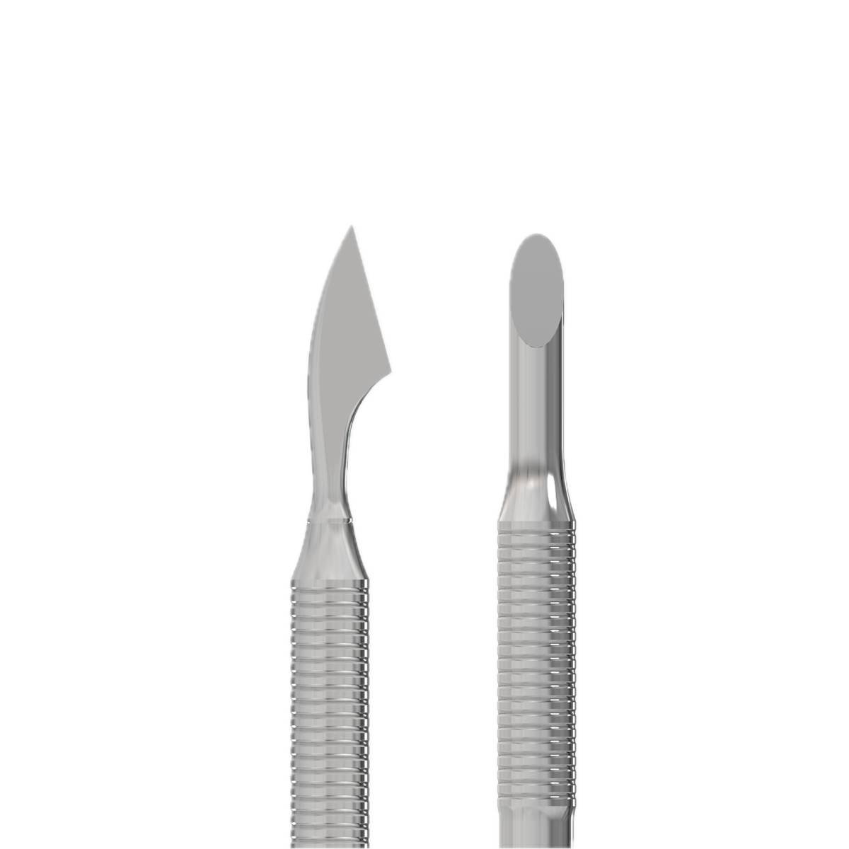 Το λοξό άκρο, γνωστό και ως “metal orange stick”, είναι ειδικά σχεδιασμένο για να ανασηκώνει και να σπρώχνει πίσω ακόμα και τα πιο σκληρά ή έντονα προσκολλημένα επωνύχια. Παράλληλα, είναι εξαιρετικό για τον καθαρισμό του ελεύθερου άκρου του νυχιού και την αφαίρεση υπολειμμάτων ημιμόνιμου βερνικιού. Το μαχαιρίδιο (hatchet) χρησιμοποιείται για τον σχολαστικό καθαρισμό της ονυχαίας πλάκας από το πτερύγιο.