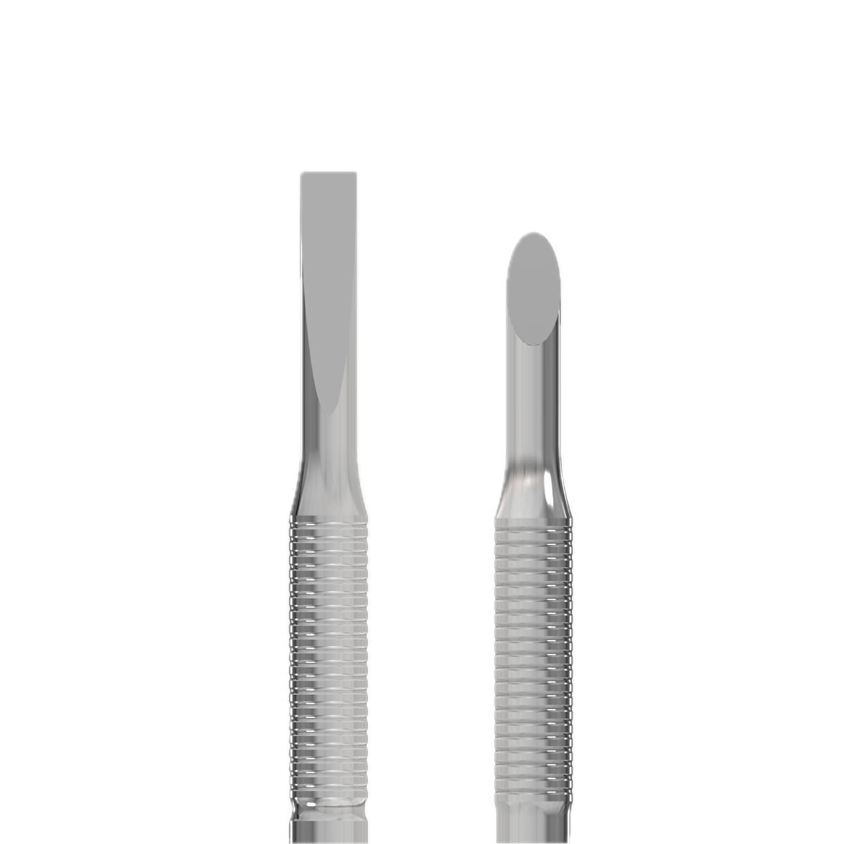 Το λοξό άκρο, γνωστό και ως “metal orange stick”, είναι ειδικά σχεδιασμένο για να ανασηκώνει και να σπρώχνει πίσω ακόμα και τις πιο τραχιά ή έντονα προσκολλημένα επωνύχια, ενώ είναι εξαιρετικό για τον καθαρισμό του ελεύθερου άκρου και την αφαίρεση υπολειμμάτων ημιμόνιμου βερνικιού. Το ευθύ pusher επιτρέπει το ομοιόμορφο ανασήκωμα του επωνυχίου για την περαιτέρω αφαίρεσή του, προσφέροντας απόλυτο έλεγχο.