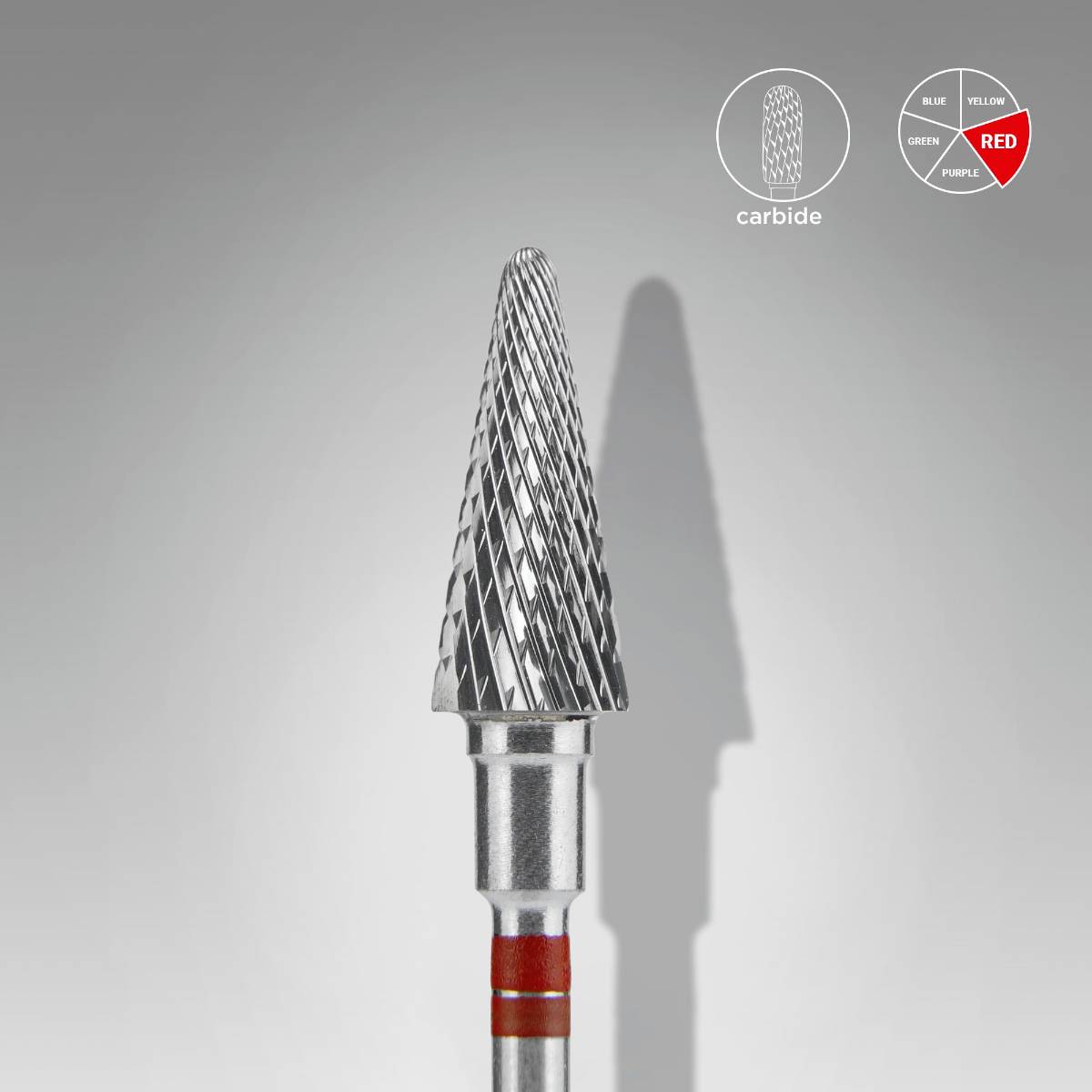Επαγγελματική φρέζα καρβιδίου STALEKS PRO EXPERT FT73R060/14 σε σχήμα κώνου (Cone) με κόκκινη χάραξη (μαλακή), ειδικά σχεδιασμένη για αριστερόχειρες. Ιδανική για ήπια αφαίρεση υλικού, διόρθωση λεπτών τεχνητών στρώσεων και επεξεργασία σκληρύνσεων σε μανικιούρ και πεντικιούρ.