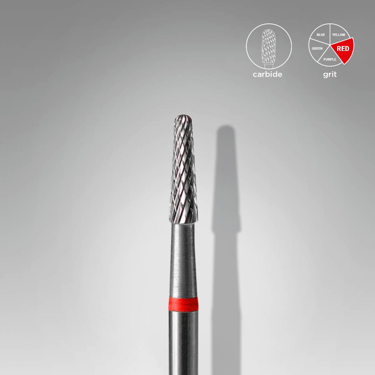 Επαγγελματική φρέζα καρβιδίου STALEKS PRO EXPERT FT71R023/8 σε σχήμα κώνου (Cone) με κόκκινη χάραξη (μαλακή). Ιδανική για ήπια αφαίρεση υλικού, διόρθωση λεπτών τεχνητών στρώσεων και επεξεργασία σκληρύνσεων σε μανικιούρ και πεντικιούρ.