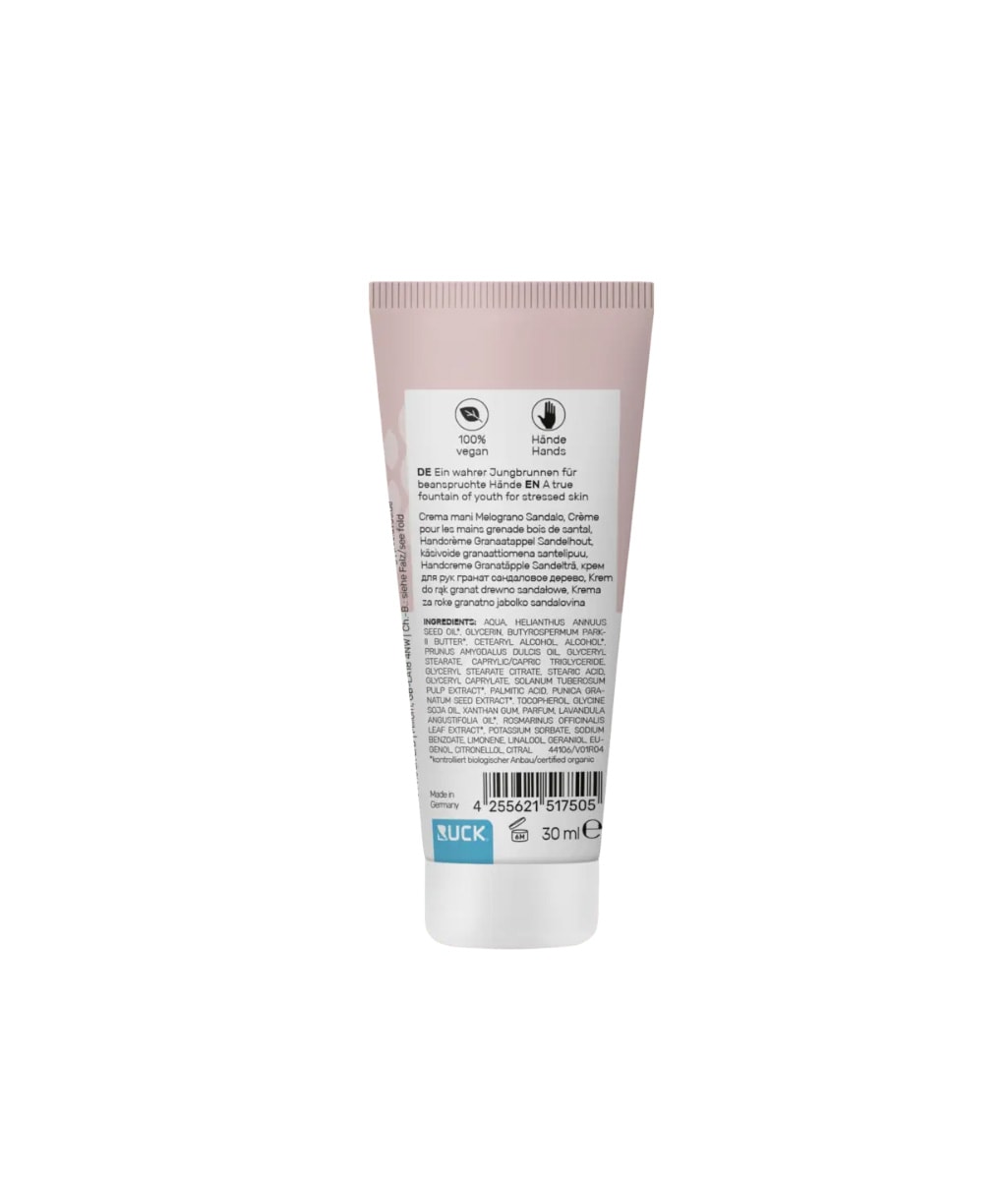 Η Κρέμα Χεριών Ρόδι & Σανδαλόξυλο της peclavus® (Handcreme Granatapfel Sandelholz) είναι ένας πραγματικός “θησαυρός” για τα χέρια, ειδικά σχεδιασμένη για να καταπολεμά ενεργά την πρόωρη γήρανση του δέρματος. Απορροφάται “πολύ γρήγορα” (zieht sehr schnell ein) και προσφέρει άμεση αίσθηση αναζωογόνησης.