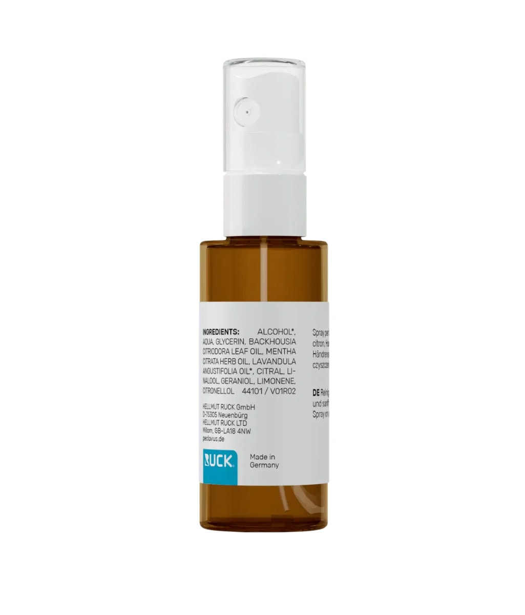 Συστατικά: Alcohol*, Aqua, Glycerin, Backhousia Citriodora Leaf Oil, Mentha Citrata Herb Oil, Lavandula Angustifolia Oil*, Citral, Linalool, Geraniol, Limonene, Citronellol *kontrolliert Biologischer Anbau / Certified Organic